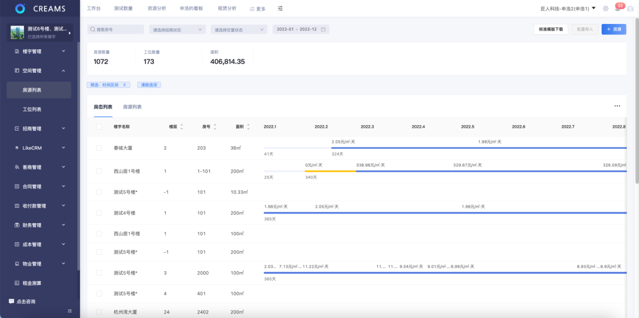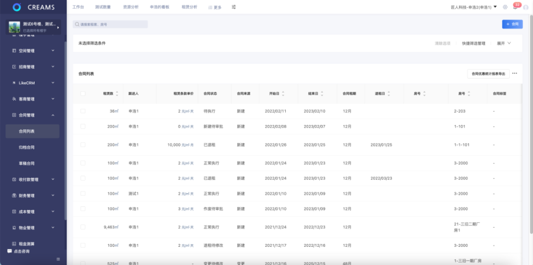 匠人科技资产经营系统CREAMS基于SaaS系统,提供资产管理整体数字化解决方案。支持项目、园区、楼宇、房源这四个层级维度快速检索、掌握整体资源情况,包括合同、租客、账单、流水等租赁动态,实现租控可视化。