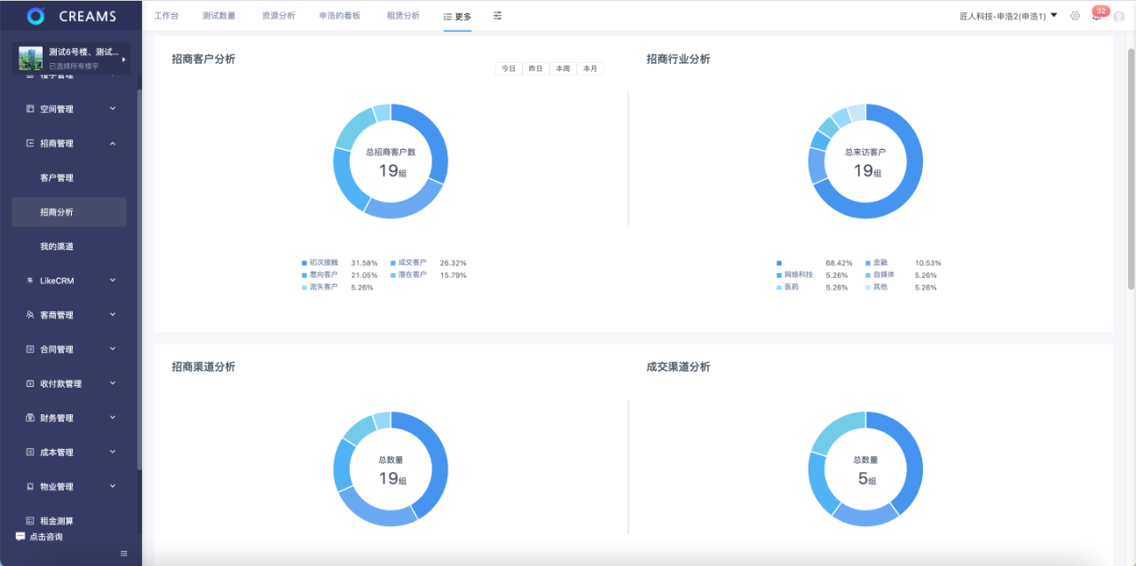 针对现有租客,资产经营系统CREAMS可通过「租客标签分析」、「行业分析」、「租客在租面积排名」、「签约企业注册资金分布」、「退租面积行业分布」等数据维度实时生成租客画像,赋能项目方优化产业结构。