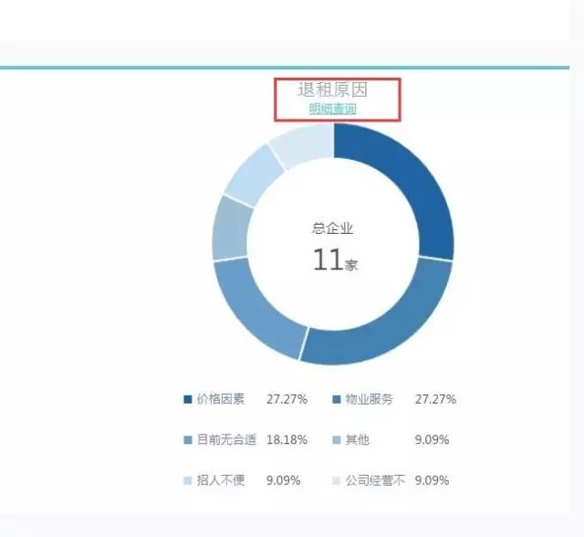 物业不行?价格太高?招人不方便?基于12个维度数据体系的支撑,CREAMS对“退租原因”的分析或许能帮助金润科技园解决一些困扰。如果产生退租情况,CREAMS就可以把关键原因记录下来,生成一套数据,图表展示非常清楚,还能下载,园区自己人就能判断出问题根源集中在哪里。