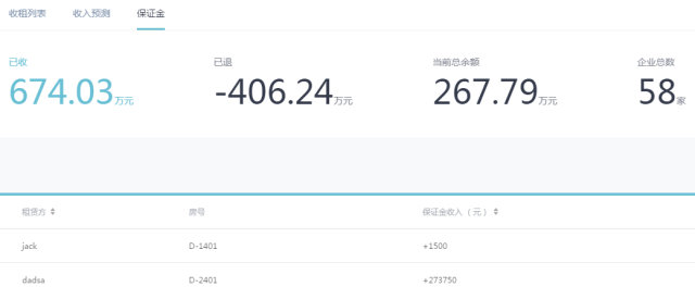 在租金管理模块中,除了原有的租金列表,收入预测功能外,新增了保证金管理功能,可以查看当前保证金总余额、总企业数、已经收到、退掉的保证金情况。