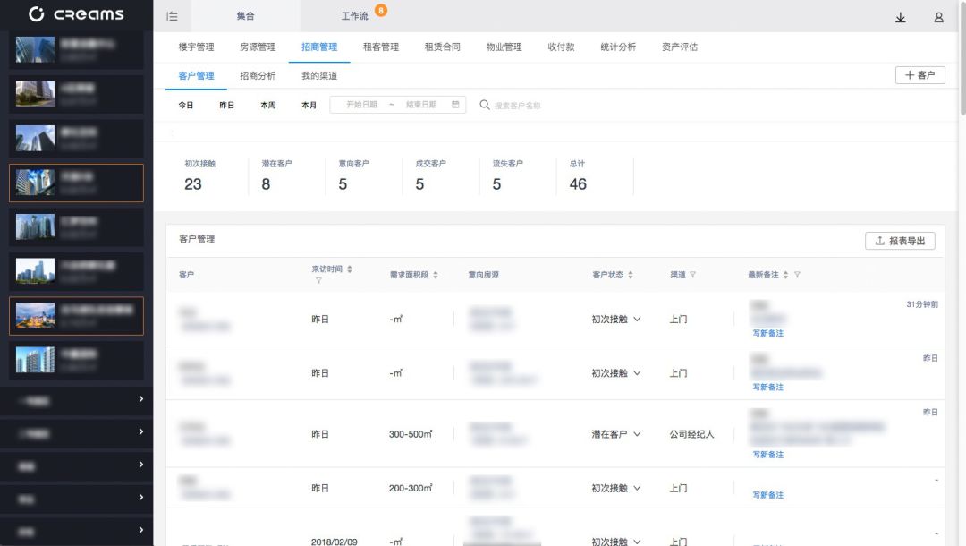 CREAMS招商管理有专门的招商分析板块,根据整个楼宇的招商数据实时更新,数据内容包括招商客户分析、招商行业分析、招商渠道分析、成交渠道分析、招商需求面积分析、客户来访总量分析。通过对这几组数据的深度分析,可以帮助楼宇招商人员对招商情况有更清晰的认识,可以更了解客户的需求、最有效的招商渠道、对项目最有意向的行业等等,都有助于招商人员开展招商工作。