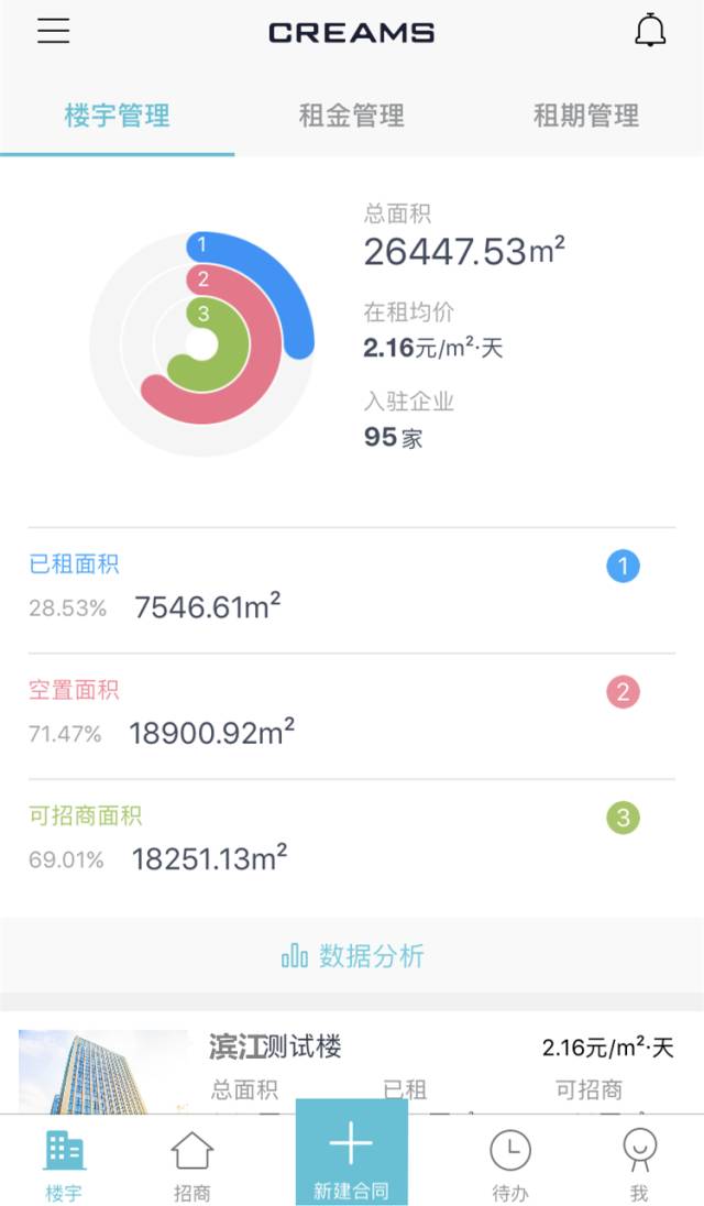 CREAMS采用的是全数字化互联网管理模式,可以将房源面积、合同、招商、租金、租期等所有相关数据录入,直接在系统里操作,自动生成电子信息、做好统计分析,并且实时反馈更新。