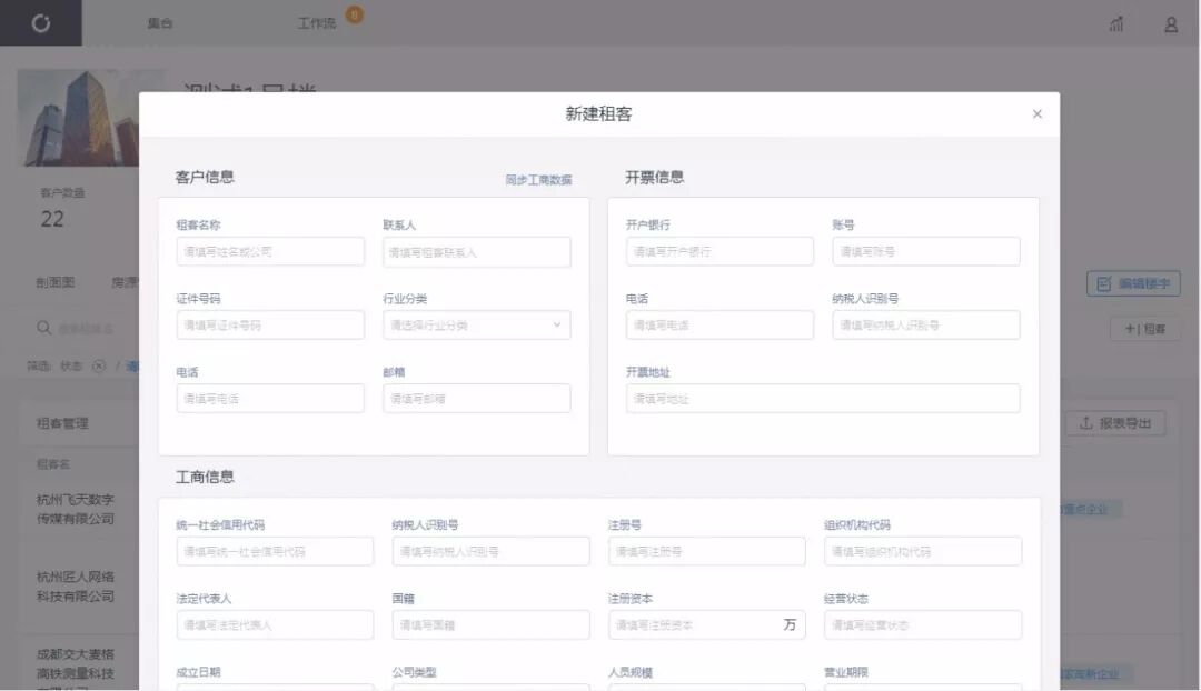 CREAMS的【租客管理】功能,全面打通了企业的工商信息。只需要输入租客名称后,工商数据即刻同步,能够更全面的将租客的所有工商信息一键导入,自动匹配,包括注册资本、公司成立时间、法人、所属行业、经营范围、发票抬头、营业执照号码等。对这些信息的掌控将会极大的方便业主对租客的管理。