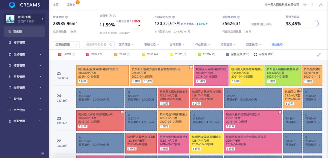 以剖面图形式展示单一项目内部的招租情况,不同颜色表示不同的在租状态,通过直观的视觉展现,方便细化管理项目的招商计划。