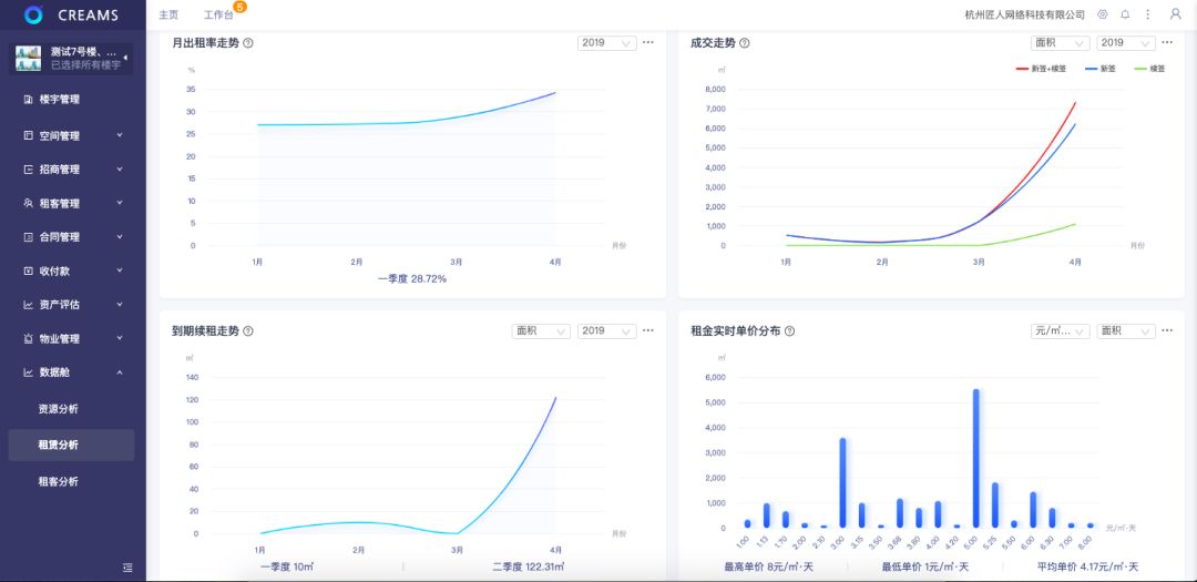 将月出租率、成交情况、续租情况、租金单价等进行大数据处理后,以图表的形式呈现给资管者,帮助资管者更加直观的掌握项目状况。