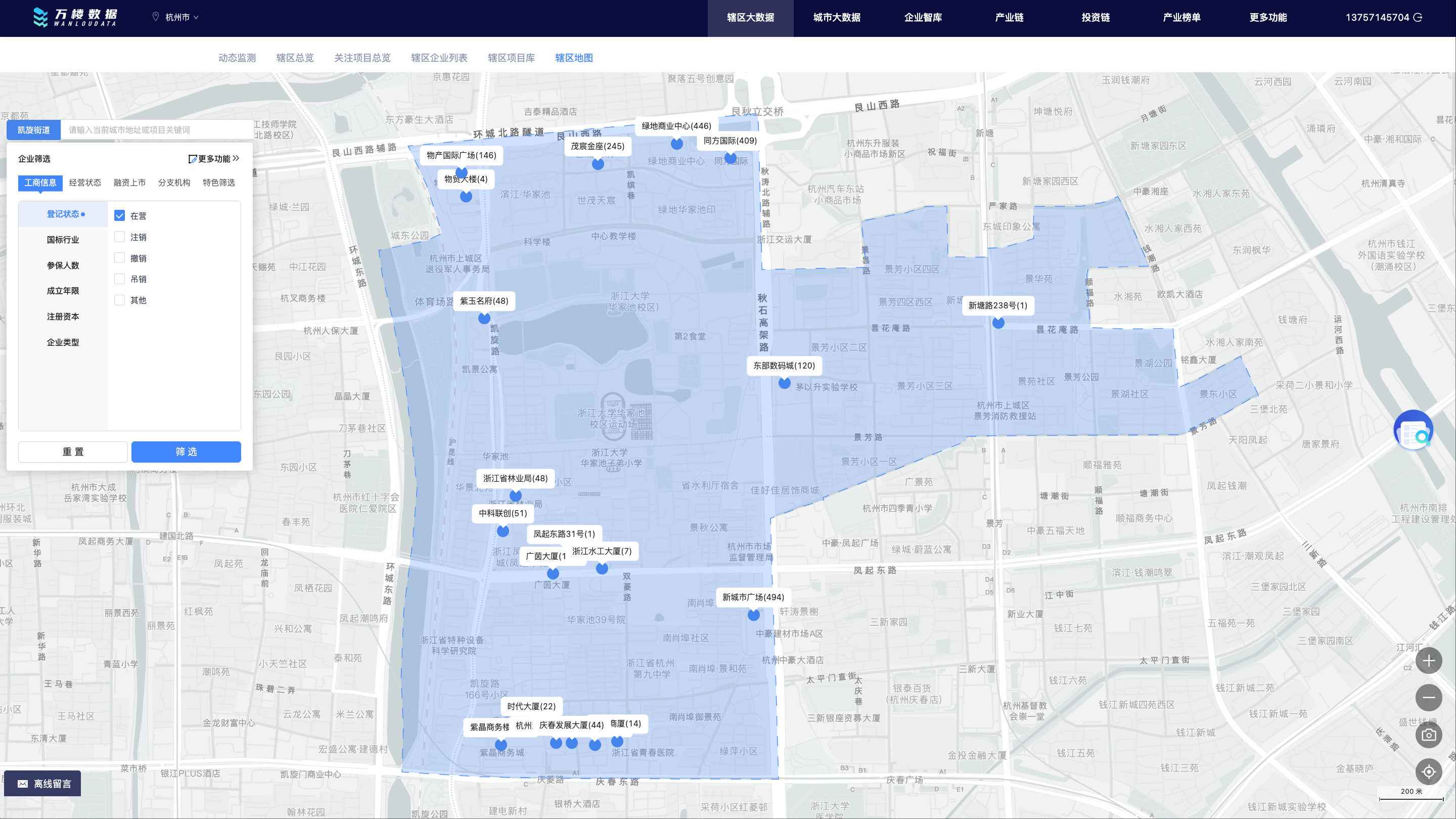 【一图感知,全域洞察】 :将数据落到空间,让管理一目了然。切细地图围栏,精准、直观展示辖区内企业的空间分布、产业集聚区和楼宇入驻情况。更能通过组合筛选关键指标直达辖区重点企业,开展深度分析。