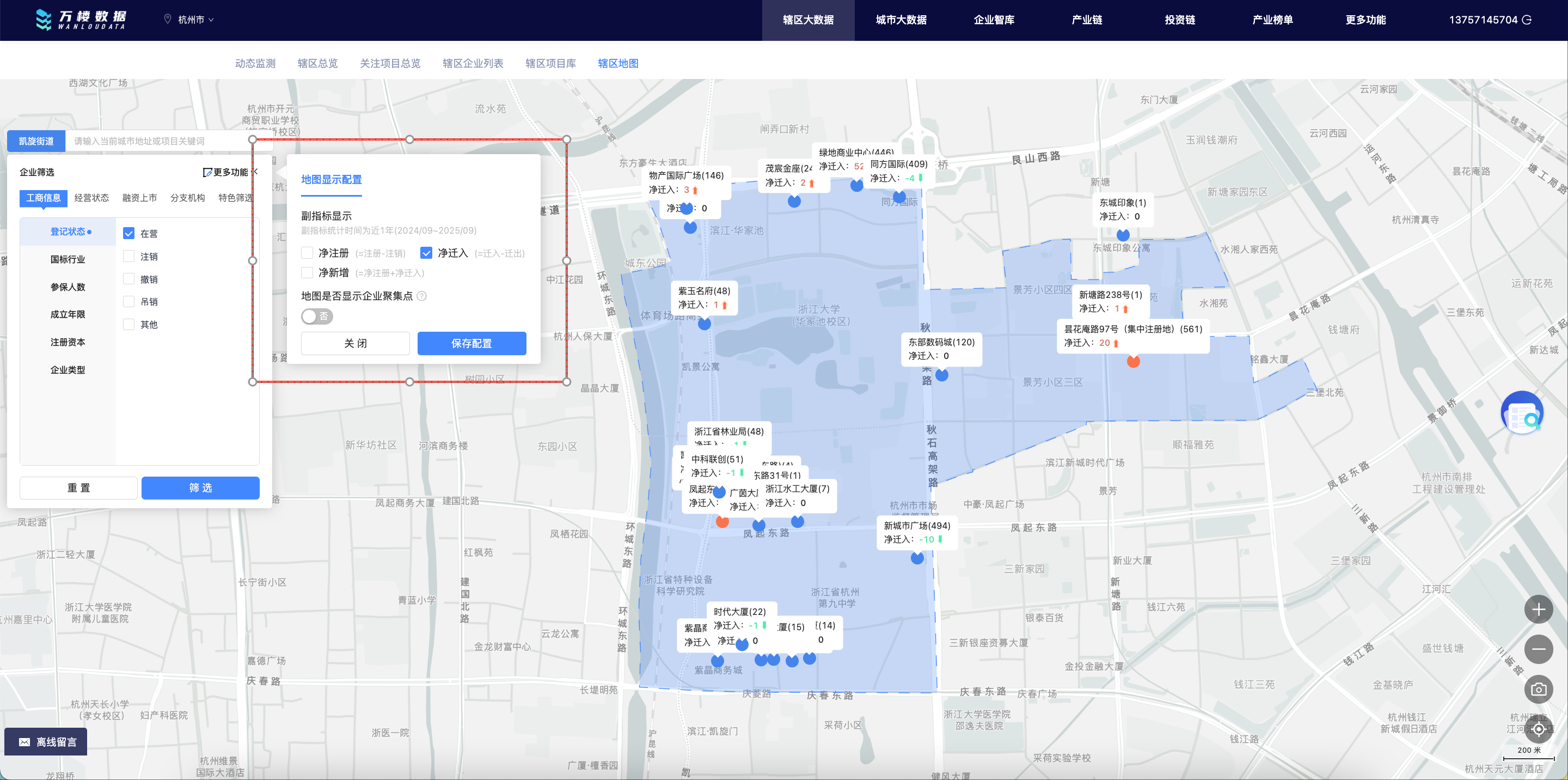 万楼支持通过工商信息、融资上市、分支机构、经营状况等多维度条件灵活筛选企业,并实时在地图上展示空间分布。关键指标一屏掌控,包括净注册、净新增、净迁入企业数据,以及企业总数、新增/注销/迁入迁出趋势、国家高新与专精特新企业数量等。