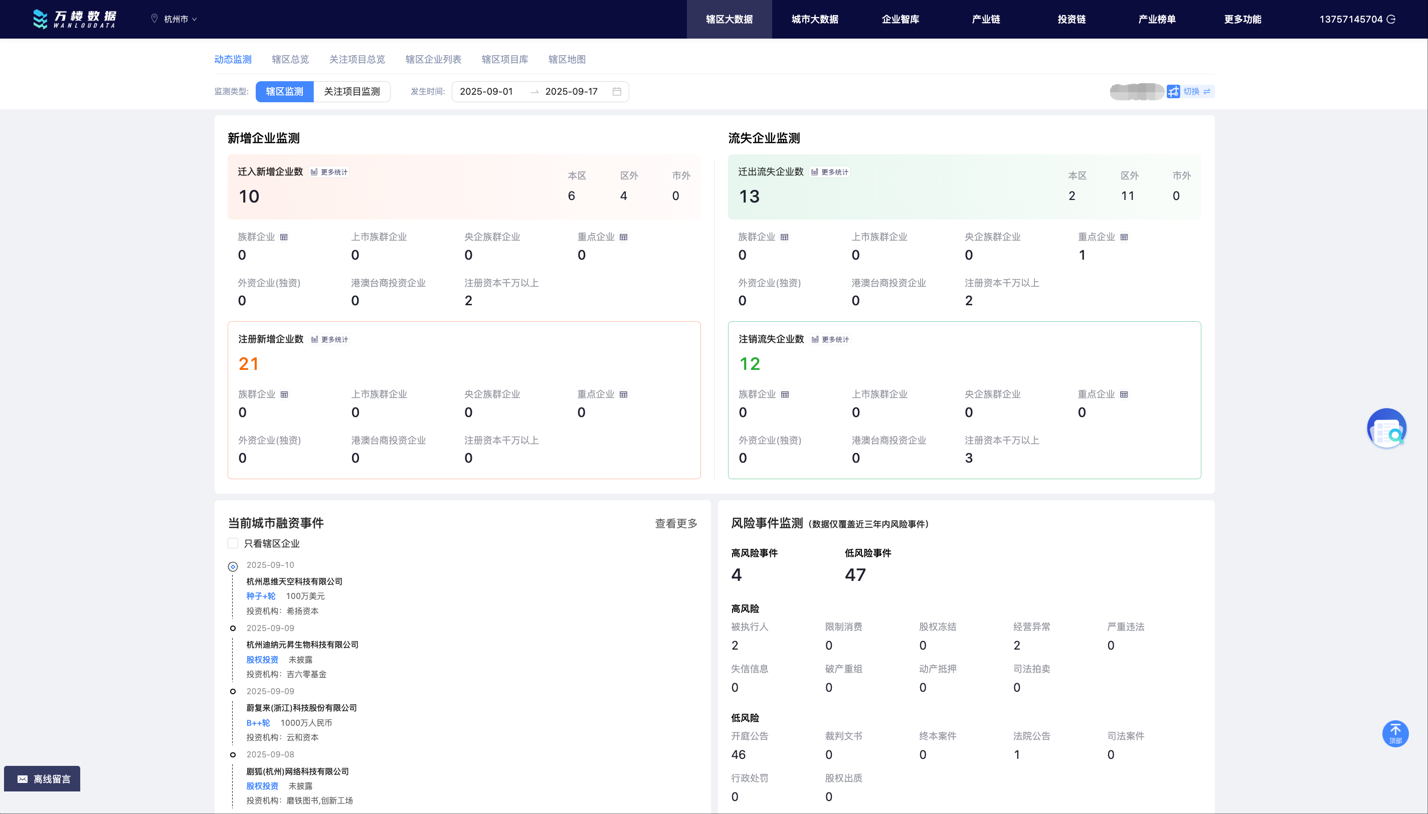 万楼实时监测并展示街道内企业的注册、迁入、迁出及注销动态,支持按时间范围灵活筛选目标时段内的数据,并对企业依据本区、区外、市外进行自动分层归类,对上市企业、重点企业、外资企业、注册资本千万以上企业等重点企业进行标注,动态统计各类企业数量与结构变化,第一时间锁定高价值目标,实时掌握资源状况、识别招商目标与流失预警,给招商引资和企业服务工作带来精准导航。