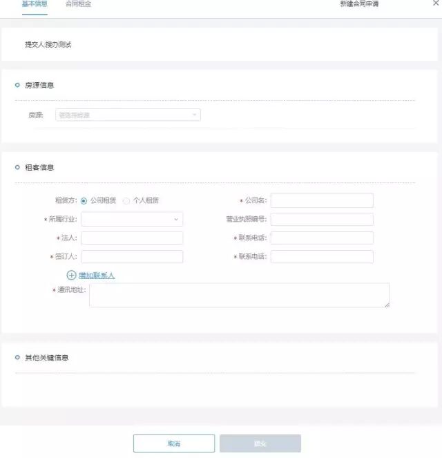 也许大家会好奇一键生成合同是怎么回事,在CREAMS里展示其实流程非常简单。点击新建一份合同,填完基本信息和租金数据后,后台会迅速反应,生成电子合同,同步线上审批,用时也就10分钟而已。