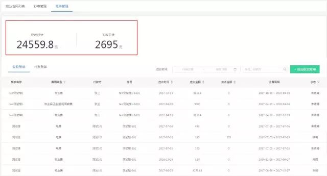 根据列表中的应收时间、应付时间、费用类型、账单状态(结清、未结清、关闭)、付款人、收款人,房号等等关键词,均能开展筛选工作,以便高效整理楼宇物业的各种支出,账单展示也更具人性化。