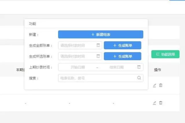 以电表为例,通过右上方“功能选择”进入新建页面,填写关联房源和电表信息,确认后即可生成一份新的电表单子。