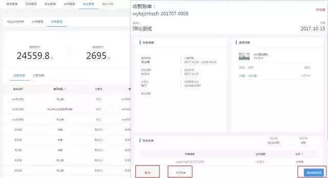 【操作已有收付款账单】在既有的账单里,可以显示相关企业的物业费用明细和房源详情,还能手动添加收款记录,并进行删除和关闭账单的操作。