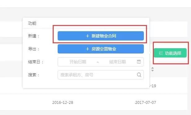 【新建物业合同】点击“功能选择”项,可直接线上生成一份新的物业合同,其中包含基本信息和物业信息。