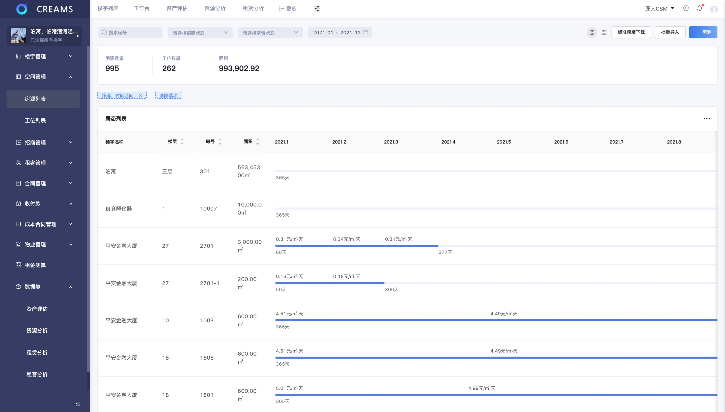 在匠人资产管理数字化系统CREAMS里,我们设计了很多数据功能来赋能经营力,比如计租率、计租均价、流转空置期、租金坪效、现金流的实时计算,通过数据穿透形成租金流失排名、房源空置天数排名等等。
