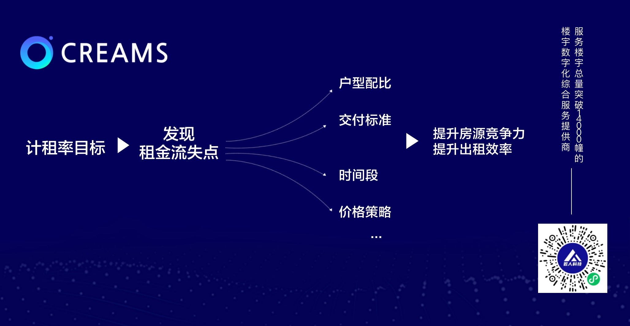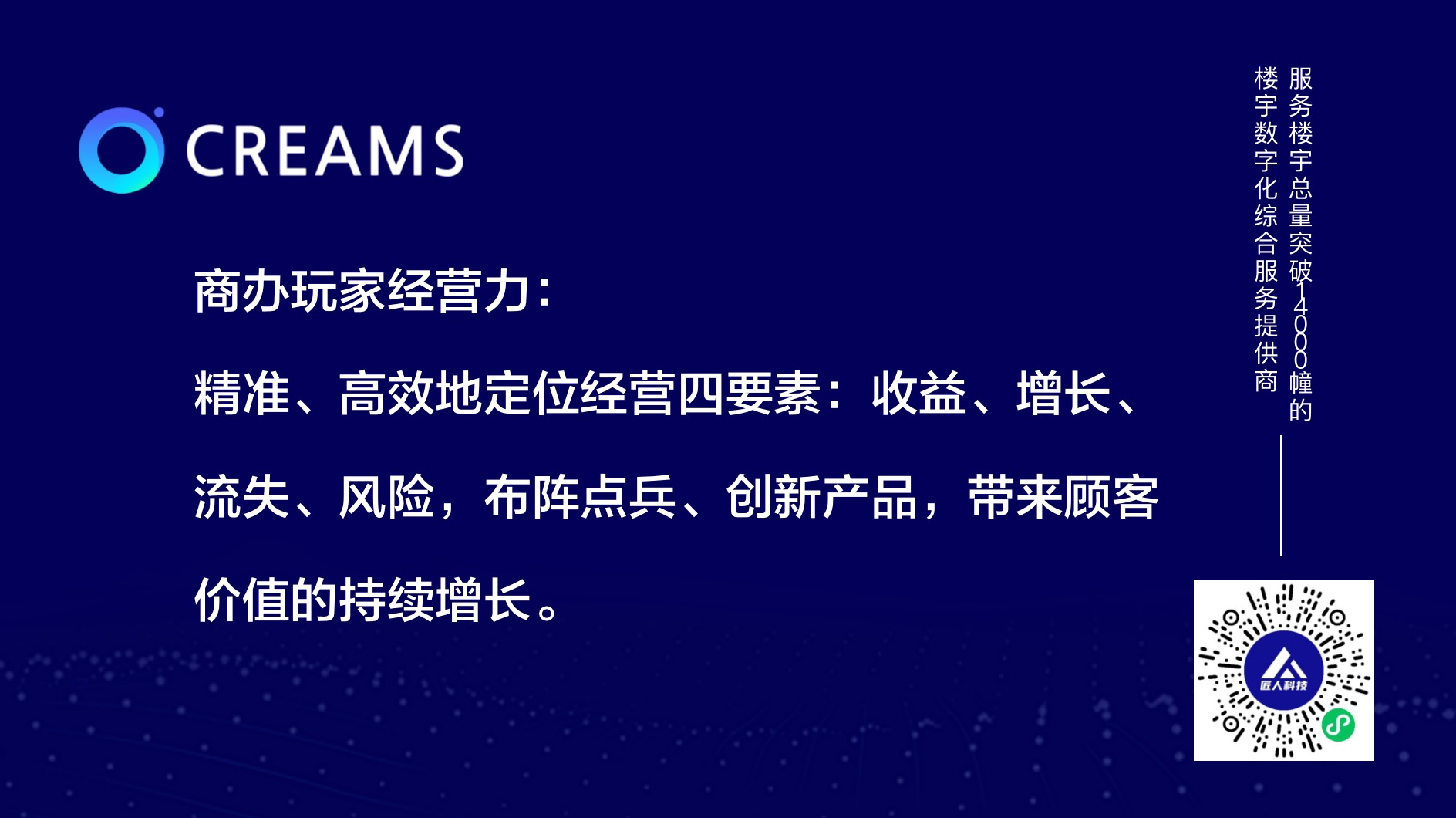针对匠人科技每一个CREAMS客户,我们今年将增加“项目运营数据解读“的售后服务。我们希望通过分析项目实际数据表现,帮助客户查流失、控风险,从而实现持续增长。