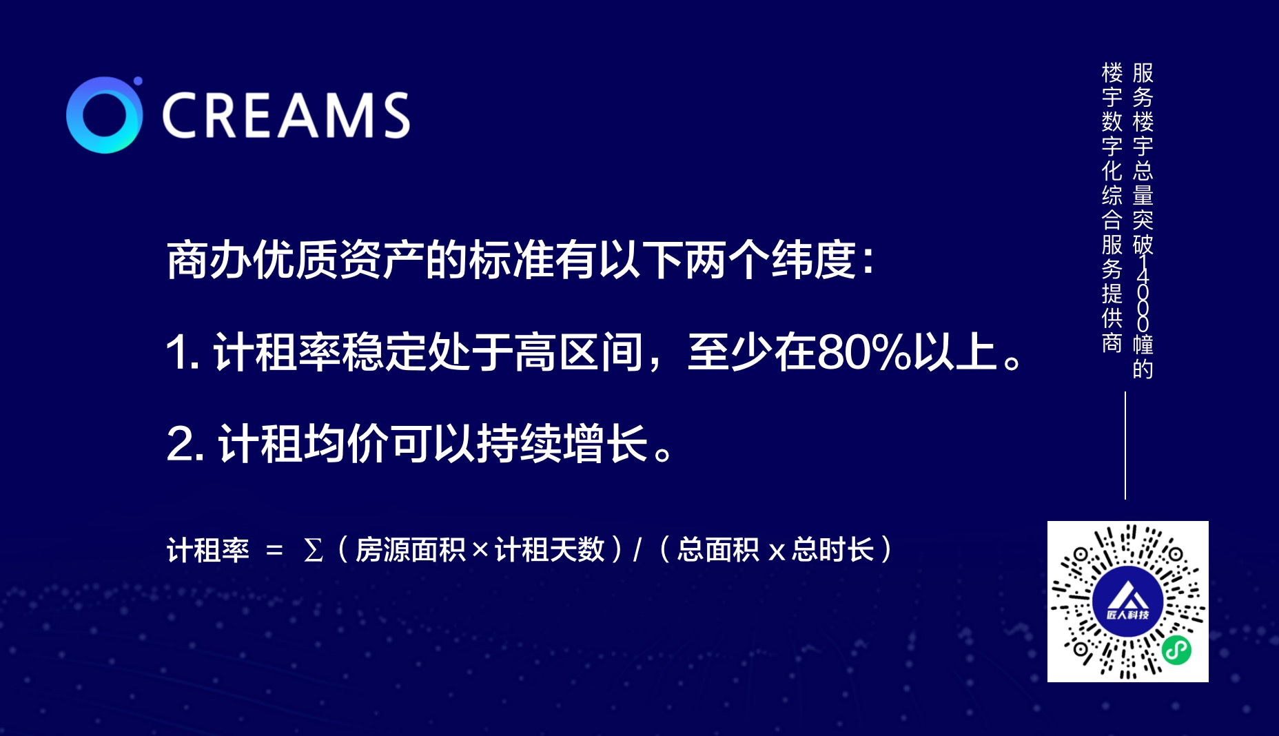 对于商办优质资产的标准,我认为有以下两个纬度:1)计租率稳定处于比较高的区间,至少在80%以上。当我们20%租金利润在流失,说明这个项目的稳定性和竞争力仍然比较薄弱。一旦产品竞争力比较薄弱,很容易被别的项目干掉,假设当前节点计租率80%,很快就有可能变成70%、60%;2)计租均价可以持续增长。
