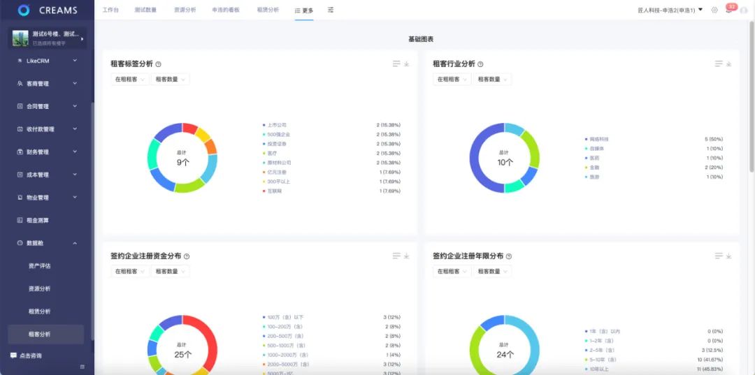 针对现有租客,资产经营系统CREAMS可通过「租客标签分析」、「行业分析」、「租客在租面积排名」、「签约企业注册资金分布」、「退租面积行业分布」等数据维度实时生成租客画像,赋能项目方优化产业结构。